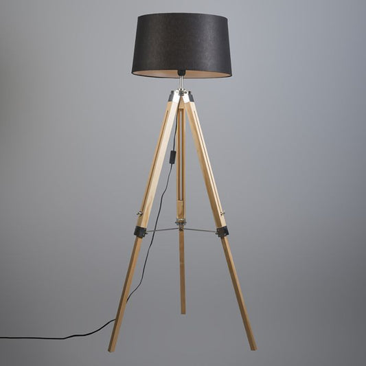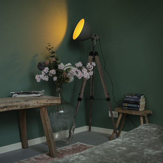 Industriële vloerlamp op houten tripod met grijze kap